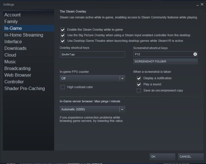 Backing up your screenshots to the Steam Cloud is simple. First, open up Steam and Navigate toSettings past selecting the tab,Steam, in the upper-correct-hand corner of your screen. Next, selectIn-Game from the available options. This menu will display your electric current shortcut key for taking an in-game snap. Furthermore, it provides you lot the option to change your default Steam screenshot folder.